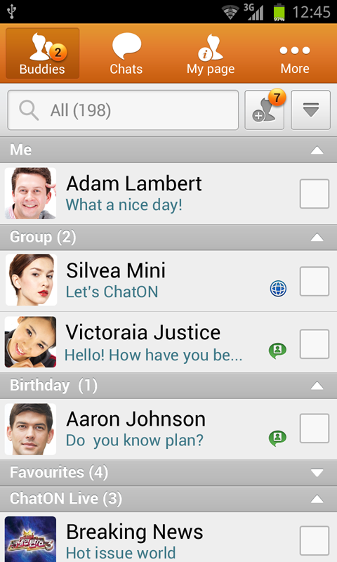 ChatON is installed in the No.1 Samsung smart phones (Galaxy S4, Galaxy S3, Galaxy Note2, Galaxy Camera). Express yourself to friends or groups of friends and share your life with them using this global social communication service.