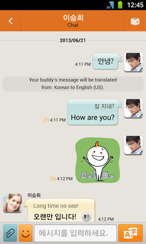 2) Chat with friends speaking other languages using the Auto translation function. (To and from Korean, Chinese, Japanese, English / From German, French, Spanish, Italian, and Portuguese to English, and vice versa)